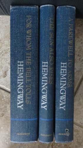 three books by Ernest Hemingway, in uniform binding: "The Sun Also Rises" (1954), "A Farewell to Arms" (1957), and "For Whom the Bell Tolls" (1968)